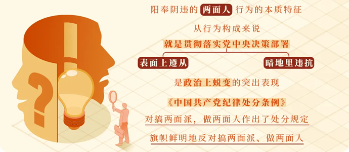 陽奉陰違的兩面人行為的本質(zhì)特征,從行為構(gòu)成來說,就是貫徹落實(shí)黨中央決策部署表面上遵從,暗地里違抗,是政治上蛻變的突出表現(xiàn)。
