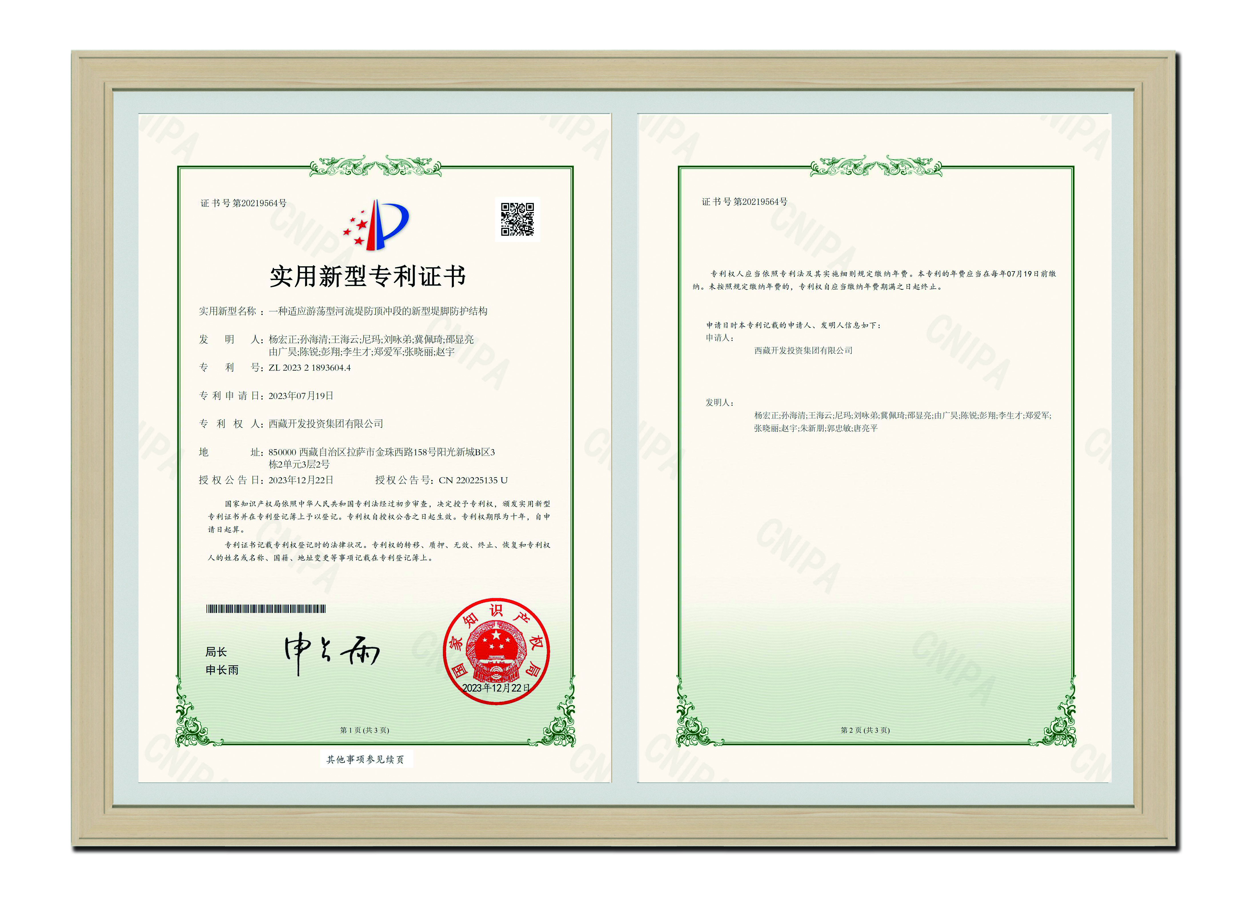 2023年12月22日 一種適應游蕩型河流堤防頂沖段的新型堤腳防護結構-實用新型專利證書