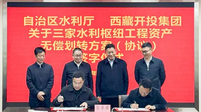 12月11日,自治區(qū)水利廳與西藏開投集團在拉薩簽署旁多、滿拉、拉洛三大水利樞紐工程資產(chǎn)無償劃轉(zhuǎn)協(xié)議,標志著西藏國有企業(yè)改革邁出堅實步伐。自治區(qū)水利廳黨組副書記、廳長和忠華,區(qū)政府國資委黨委委員、副主任于雷,西藏開投集團黨委書記、董事長祁騰武出席簽字儀式并講話。自治區(qū)水利廳黨組成員、副廳長趙輝與西藏開投集團黨委委員、副總經(jīng)理尼瑪代表雙方簽署協(xié)議。集團領(lǐng)導(dǎo)羅布次仁、陳焱罡出席儀式。
