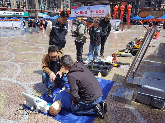 本次活動,果多水電公司向市民展示了心肺復蘇法操作演示、正壓式空氣呼吸器和安全帶等應(yīng)急救援器材的正確使用方法。昌都市委常委、常務(wù)副市長吳應(yīng)海,昌都市政府副秘書長張耀暉,昌都市應(yīng)急管理局黨委書記霍映章一行到果多水電公司安全宣傳展臺參觀了心肺復蘇法演示,并對果多水電公司本次活動給予好評。
