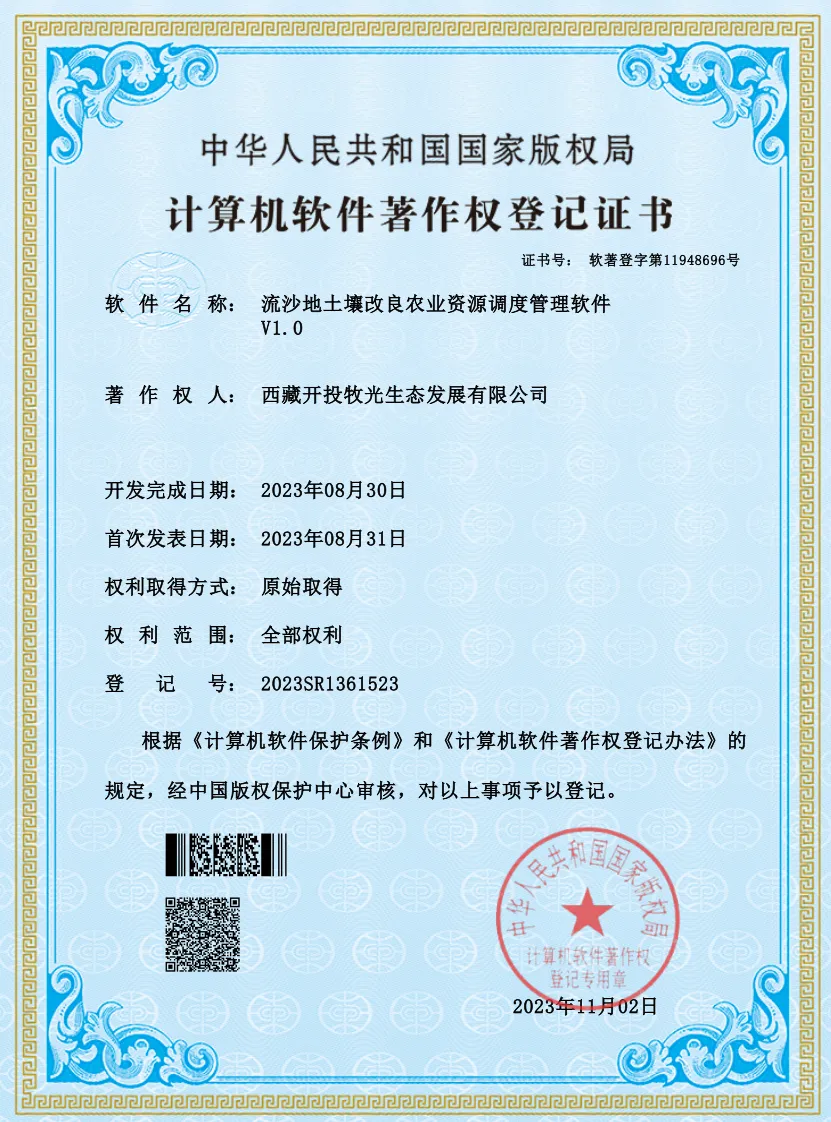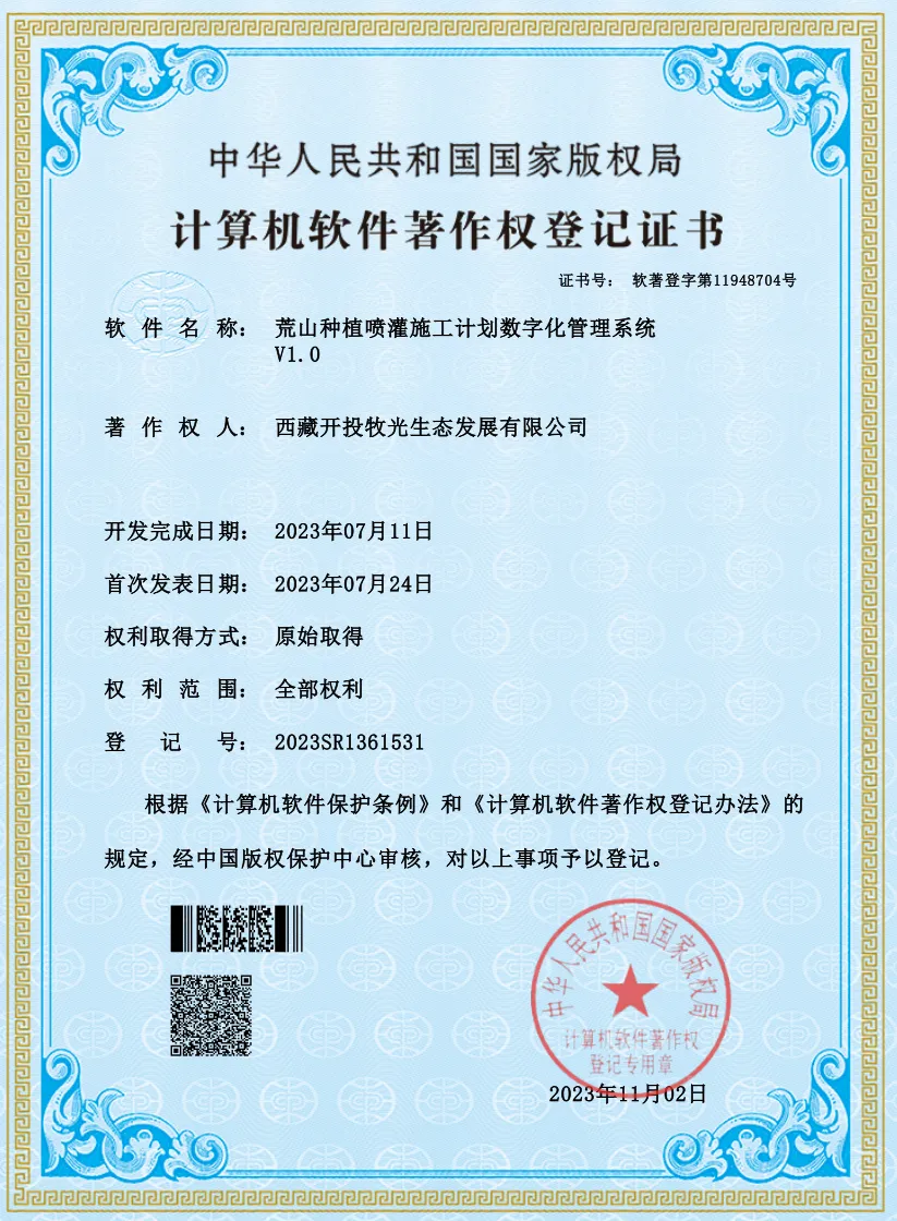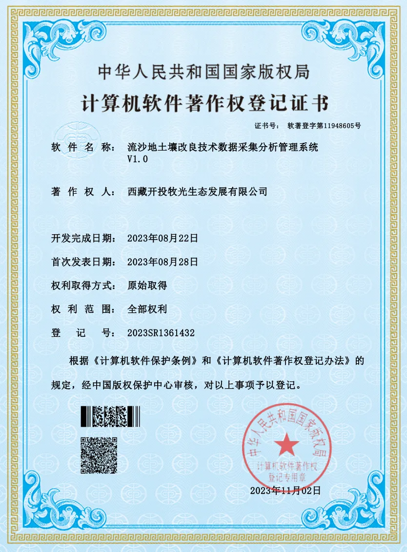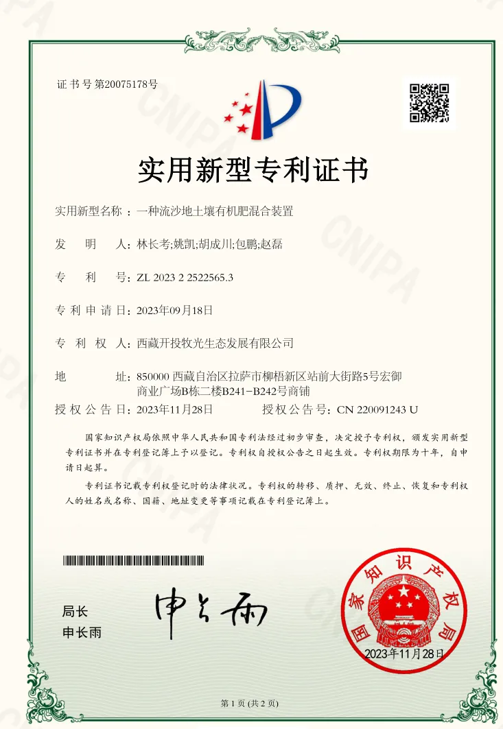 經(jīng)過一年多的摸索,西藏開投在拉薩南北山綠化工程項目形成了豐富的技術(shù)成果,于近日成功申報獲取了1項實用新型專利和5項計算機軟件著作權(quán)。分別是《一種流沙地土壤有機肥混合裝置》實用新型專利和《土壤改良種植技術(shù)項目實施進(jìn)度跟蹤管理系統(tǒng)V1.0》《流沙地土壤改良技術(shù)數(shù)據(jù)采集分析管理系統(tǒng)V1.0》《流沙地土壤改良農(nóng)業(yè)資源調(diào)度管理軟件V1.0》《荒山種植噴灌施工計劃數(shù)字化管理系統(tǒng)V1.0》《荒山種植噴灌施工智能化控制管理軟件V1.0》計算機軟件著作權(quán)。