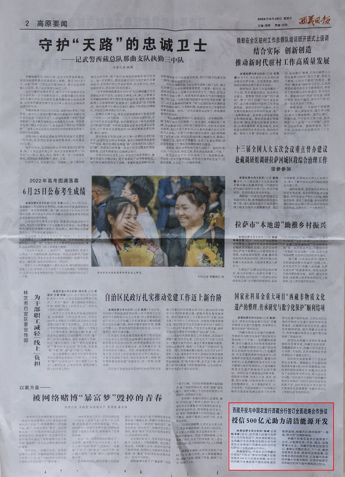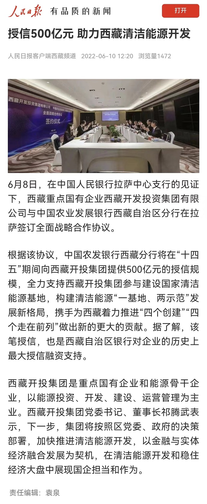 (編者按)6月10日,《人民日?qǐng)?bào)》客戶(hù)端西藏頻道報(bào)道了《授信500億元 助力西藏清潔能源開(kāi)發(fā)》?!段鞑厝?qǐng)?bào)》2022年6月10日在第2版“高原要聞”欄目刊登文章,報(bào)道《授信500億元|西藏開(kāi)投集團(tuán)與中國(guó)農(nóng)發(fā)行西藏分行簽訂全面戰(zhàn)略合作協(xié)議》。西藏電視臺(tái)2022年6月10日在西藏電視臺(tái)影視文化頻道《今晚九點(diǎn)》欄目報(bào)道了《授信500億元|西藏開(kāi)投集團(tuán)與中國(guó)農(nóng)發(fā)行西藏分行簽訂全面戰(zhàn)略合作協(xié)議》,《珠峰云》平臺(tái)同步播放。新華網(wǎng)、經(jīng)濟(jì)日?qǐng)?bào)、西藏衛(wèi)視、西藏日?qǐng)?bào)客戶(hù)端、網(wǎng)信西藏、今日頭條等媒體均報(bào)道了相關(guān)新聞。全文如下: