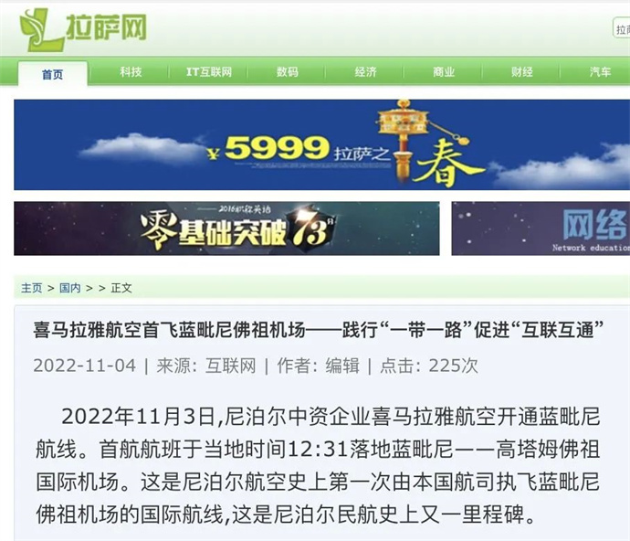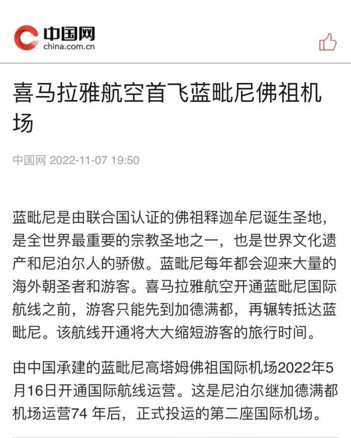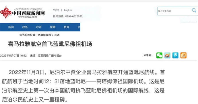 ?。ň幷甙矗?2022年11月4日至9日,中華網(wǎng)、中國網(wǎng)、中企網(wǎng)、中青網(wǎng)、中國日報網(wǎng)、光明日報、騰訊網(wǎng)、新浪網(wǎng)、搜狐網(wǎng)、今日頭條、中國旅游新聞網(wǎng)、中國西藏新聞網(wǎng)、拉薩新聞網(wǎng)、西藏生活網(wǎng)、西藏視窗、每日經(jīng)濟(jì)西藏、西藏途游網(wǎng)等媒體報道了《喜馬拉雅航空首飛藍(lán)毗尼佛祖機(jī)場》文章。摘要如下: