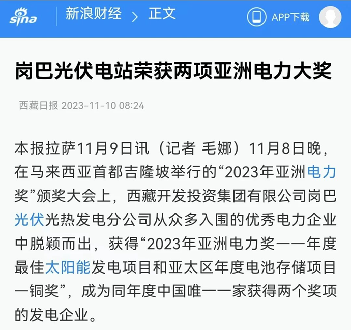 科技日?qǐng)?bào)、西藏日?qǐng)?bào)、西藏日?qǐng)?bào)客戶(hù)端等多個(gè)媒體報(bào)道了《西藏開(kāi)發(fā)投資集團(tuán)有限公司崗巴光伏電站榮獲2023年度兩項(xiàng)亞洲電力大獎(jiǎng)》
