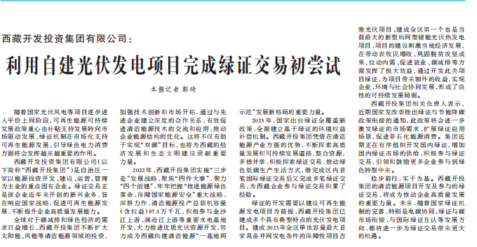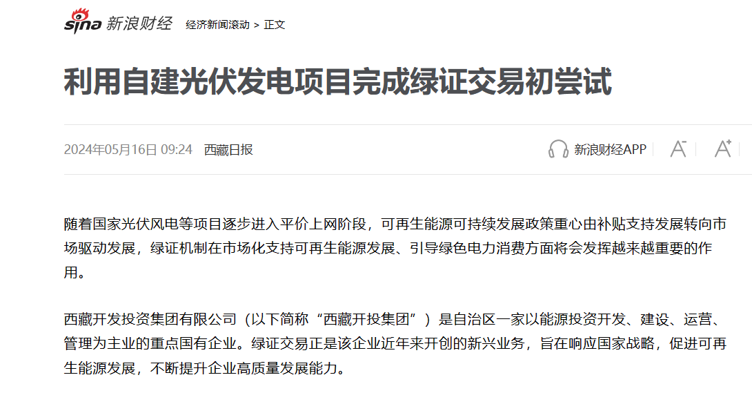 西藏日?qǐng)?bào)、新浪財(cái)經(jīng)等媒體報(bào)道利用自建光伏發(fā)電項(xiàng)目完成綠證交易初嘗試
