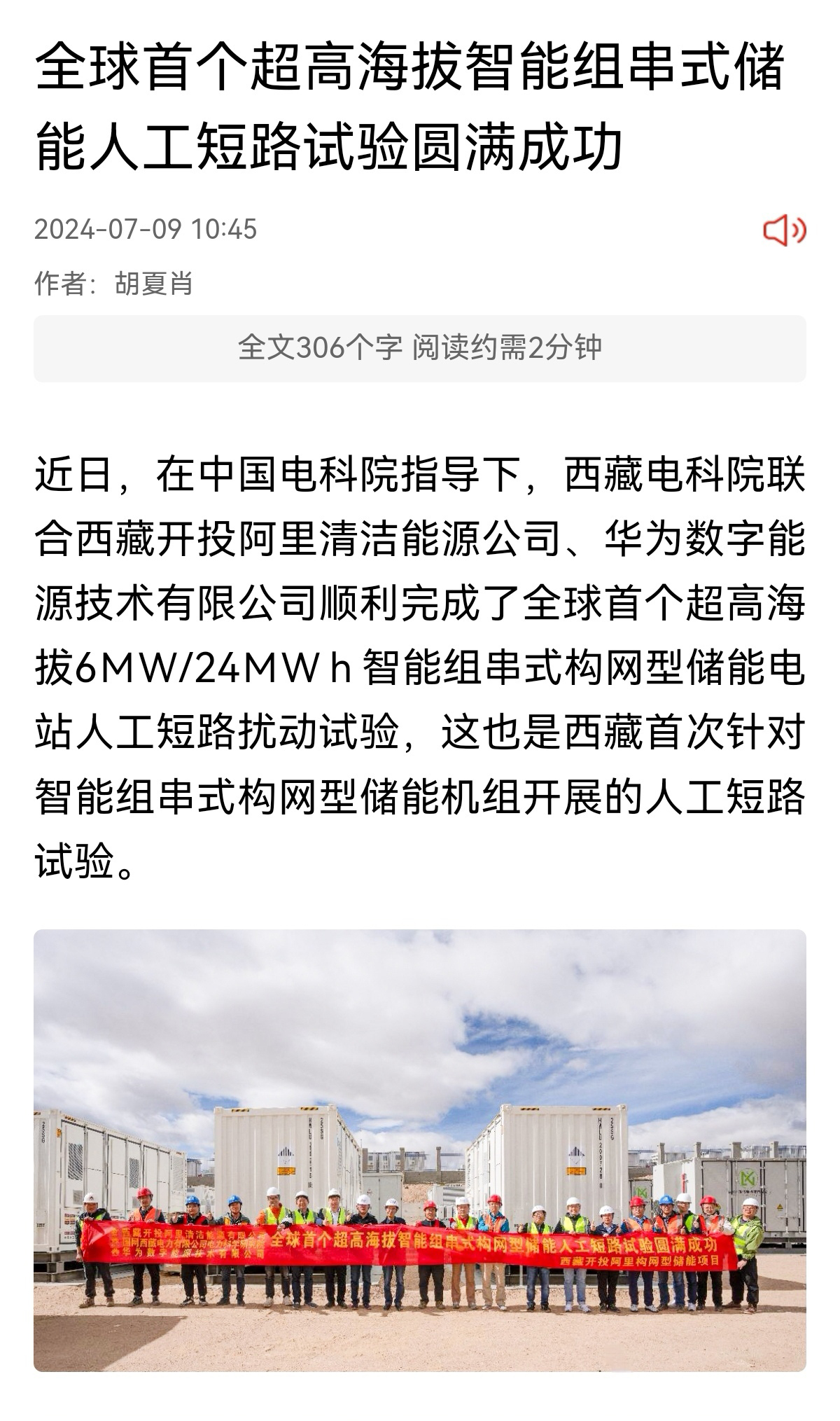 媒體報(bào)道丨全球首個(gè)超高海拔智能組串式儲(chǔ)能人工短路試驗(yàn)圓滿成功