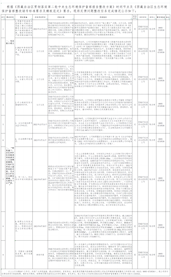 西藏開投海通水泥有限公司關(guān)于第二輪中央生態(tài)環(huán)境保護督察反饋問題整改落實情況的公示