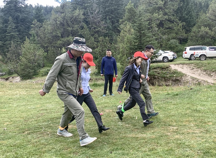 座談結(jié)束后,全體黨員面向黨旗莊嚴(yán)宣誓,重溫入黨誓詞,激勵(lì)永葆入黨初心。最后,兩支部開展了以“重溫紅色”為主題的戶外團(tuán)建活動(dòng),通過重走長征路、黨建知識(shí)問答、紅色詞匯你比我猜、兩人三足等活動(dòng)進(jìn)一步增進(jìn)支部交流互動(dòng)?;顒?dòng)現(xiàn)場,參賽隊(duì)員充分發(fā)揚(yáng)團(tuán)隊(duì)精神,積極參與,精誠合作,加油聲、吶喊聲、歡呼聲此起彼伏。