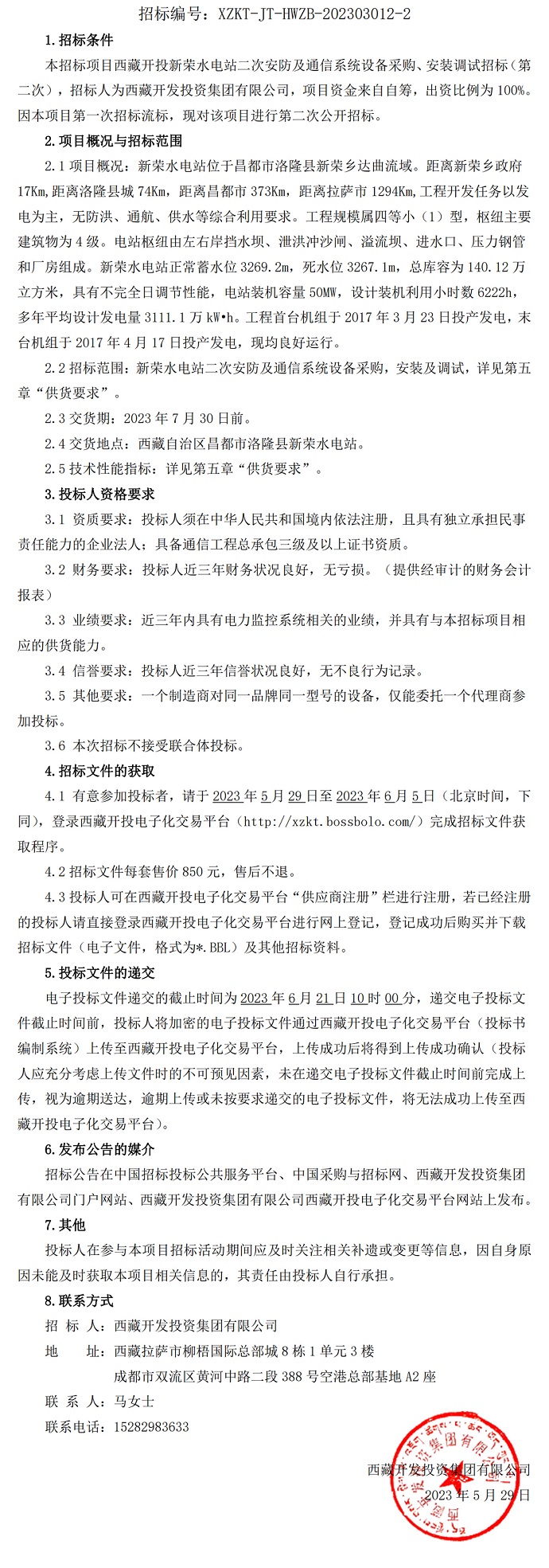 藏開(kāi)投新榮水電站二次安防及通信系統(tǒng)設(shè)備采購(gòu)、安裝調(diào)試招標(biāo)(第二次)公告