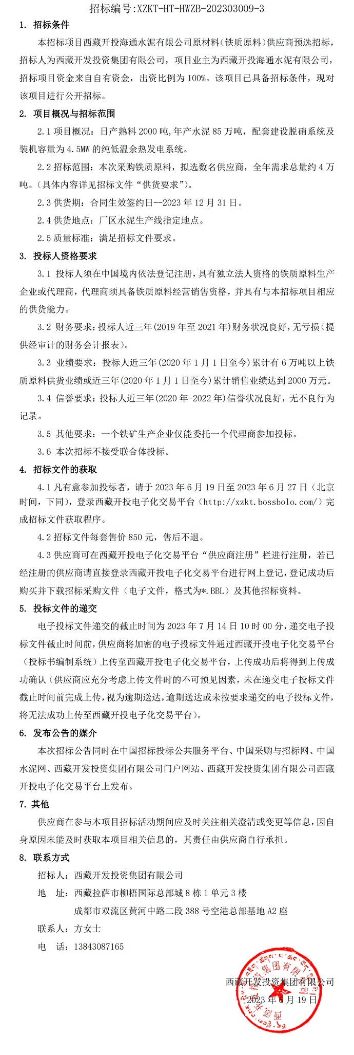 西藏開投海通水泥有限公司原材料(鐵質(zhì)原料)供應(yīng)商預(yù)選招標(biāo)公告