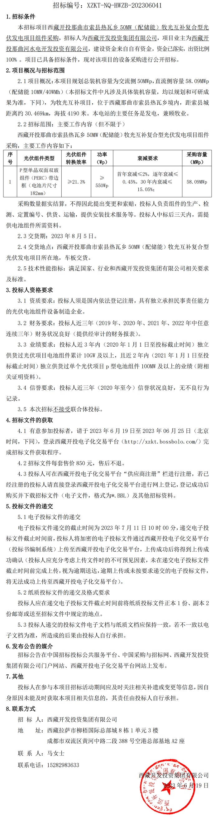 西藏開投那曲市索縣熱瓦鄉(xiāng)50MW(配儲能)牧光互補復合型光伏發(fā)電項目光伏組件采購招標公告