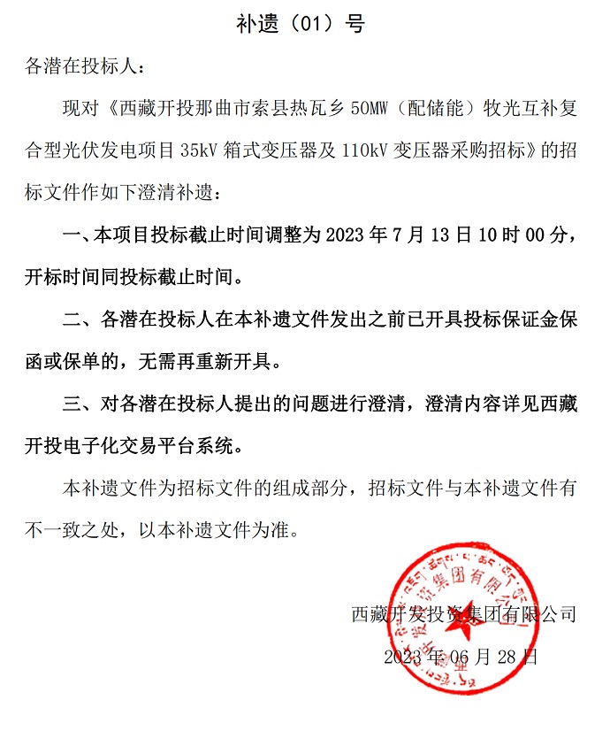 西藏開投那曲市索縣熱瓦鄉(xiāng)50MW(配儲(chǔ)能)牧光互補(bǔ)復(fù)合型光伏發(fā)電項(xiàng)目35kV箱式變壓器及110kV變壓器采購招標(biāo)