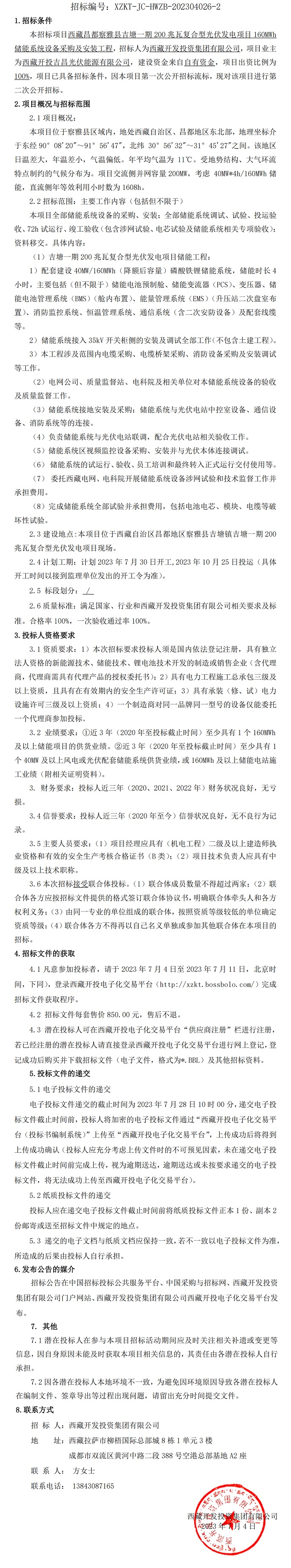 西藏昌都察雅縣吉塘一期200兆瓦復(fù)合型光伏發(fā)電項目160MWh儲能系統(tǒng)設(shè)備采購及安裝工程招標(biāo)公告(第二次)