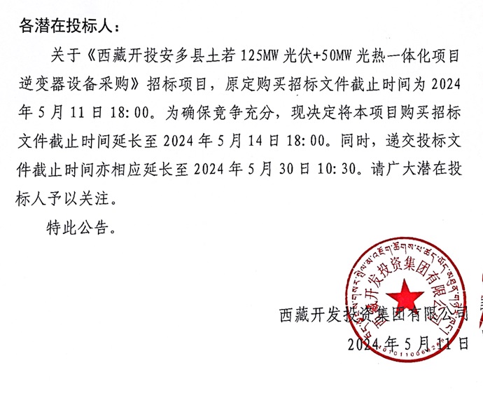 關(guān)于延長《西藏開投安多縣土若125MW光伏+50MW 光熱一體化項目逆變器設(shè)備采購招標》購買招標文件截止時間的公告