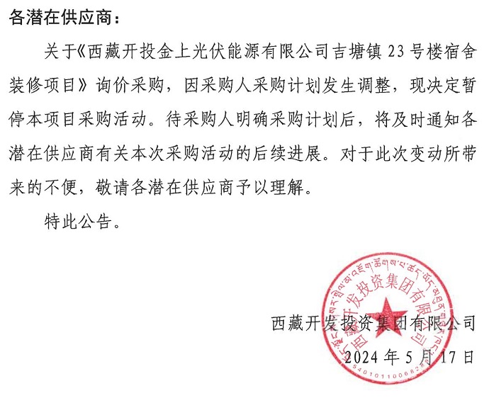 關(guān)于暫停《西藏開投金上光伏能源有限公司吉唐鎮(zhèn)23號(hào)樓宿舍裝修項(xiàng)目》詢價(jià)采購(gòu)活動(dòng)的公告