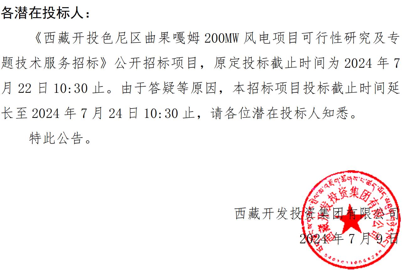 關于延長《西藏開投色尼區(qū)曲果嘎姆200MW風電項目可行性研究及專題技術服務招標》投標截止時間的公告