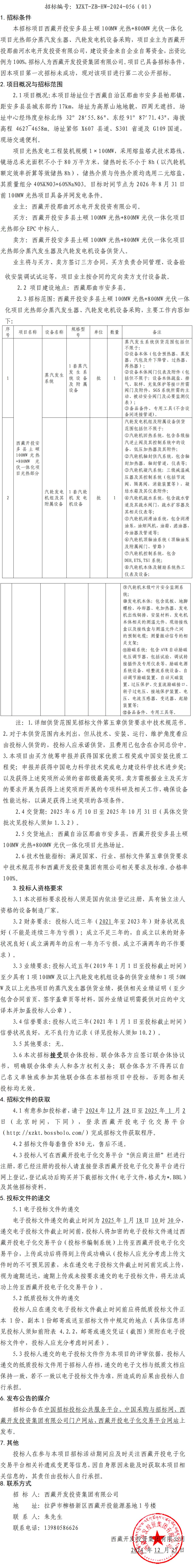 西藏開投安多縣土碩 100MW 光熱+800MW 光伏一體化項目光熱部分蒸汽發(fā)生器、汽輪發(fā)電機設(shè)備采購招標(第二次)公告