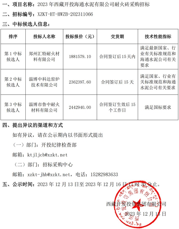 中標(biāo)候選人公示-2023年海通水泥耐火磚采購